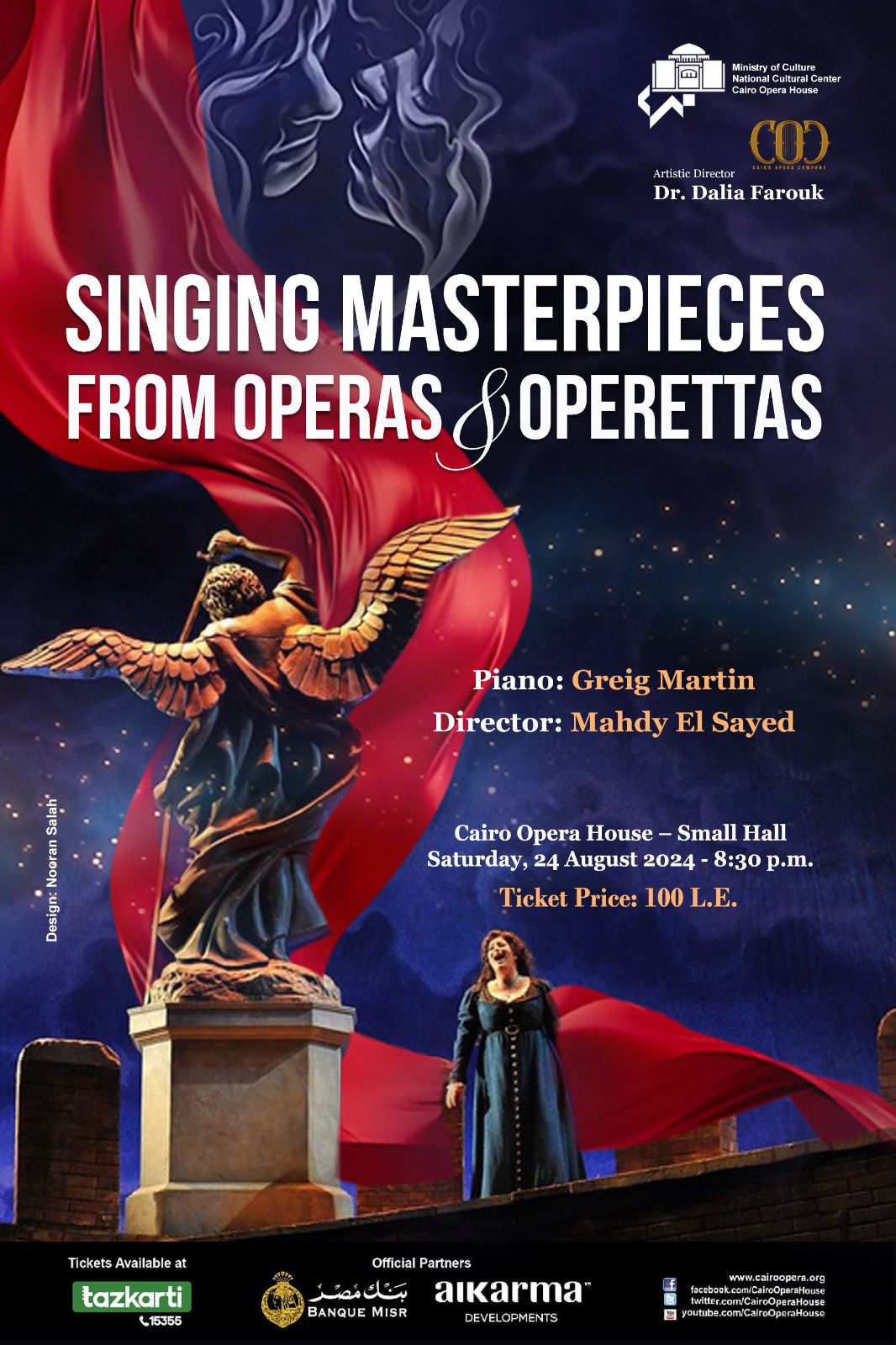 ضمن توجهات الثقافة المصرية لتقديم ونشر الفنون الجادة والعالمية تنظم دار الأوبرا برئاسة الدكتورة لمياء زايد حفلا يقدمه نجوم فرقة أوبرا القاهرة تحت إشراف الدكتورة داليا فاروق المدير الفنى للفرقة فى الثامنة والنصف مساء السبت ٢٤ أغسطس بالمسرح الصغير بمصاحبة عازف البيانو جريج مارتن وإخراج مهدى السيد .