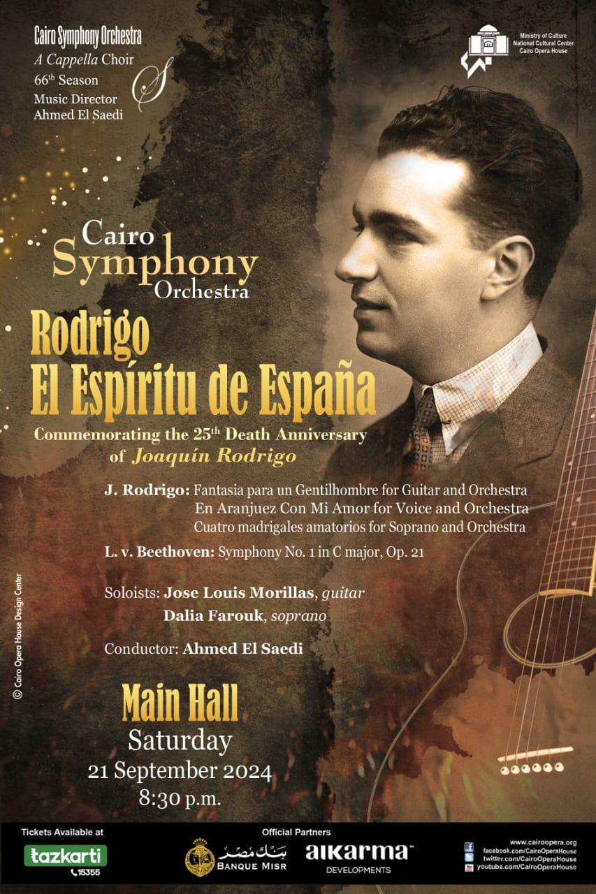 ضمن اهتمامات الثقافة المصرية لتقديم مختلف ألوان الفنون الجادة تنظم دار الأوبرا المصرية برئاسة الدكتورة لمياء زايد حفلا لأوركسترا القاهرة السيمفونى بقيادة المايسترو أحمد الصعيدى 'المدير الموسيقى للأوركسترا' تحت عنوان (رودريجو روح أسبانيا ) فى الثامنة والنصف مساء السبت ٢١سبتمبر ٢٠٢٤ على المسرح الكبير ومشاركة السوليستات السوبرانو داليا فاروق وعازف الجيتار الأسبانى خوسيه لويس موريلياس .