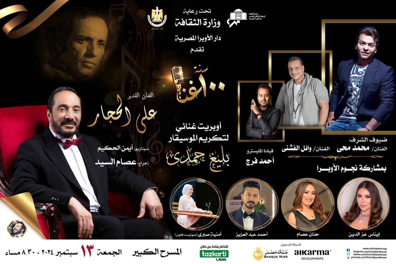 تحت رعايةالدكتور أحمد فؤاد هنو وزير الثقافة وفي إطار الجهود الهادفة إلى الحفاظ على التراث الموسيقى والغنائى تواصل دار الأوبرا برئاسة الدكتورة لمياء زايد تقديم عروض المشروع الفنى ١٠٠ سنة غنا الذى يقام بالتعاون مع الفنان القدير على الحجار حيث تقام الليلة الثالثة فى الثامنة والنصف مساء الجمعة ١٣ سبتمبر على المسرح الكبير وتستضيف النجمان محمد محى و وائل الفشنى وتم تخصيصها لتكريم مشوار الموسيقار بليغ حمدى وذلك من خلال أوبريت غنائى إستعراضى تمثيلى بعنوان "أمل مصر" من إخراج عصام السيد ،اعداد الكاتب الصحفى ايمن الحكيم بمصاحبه الفرقة الموسيقية بقيادة المايسترو أحمد فرج وتصميم الاستعراضات شيرين حجازى ،جرافيك حسام احمد ،ديكور محمد الغرباوي والإضاءة ياسر شعلان، ويضم عدد من المعلومات والتسجيلات النادرة عن الرحلة الفنية للموسيقار بليغ حمدي من خلال ٢٠ لحنا من أعماله الغنائية الشهيرة