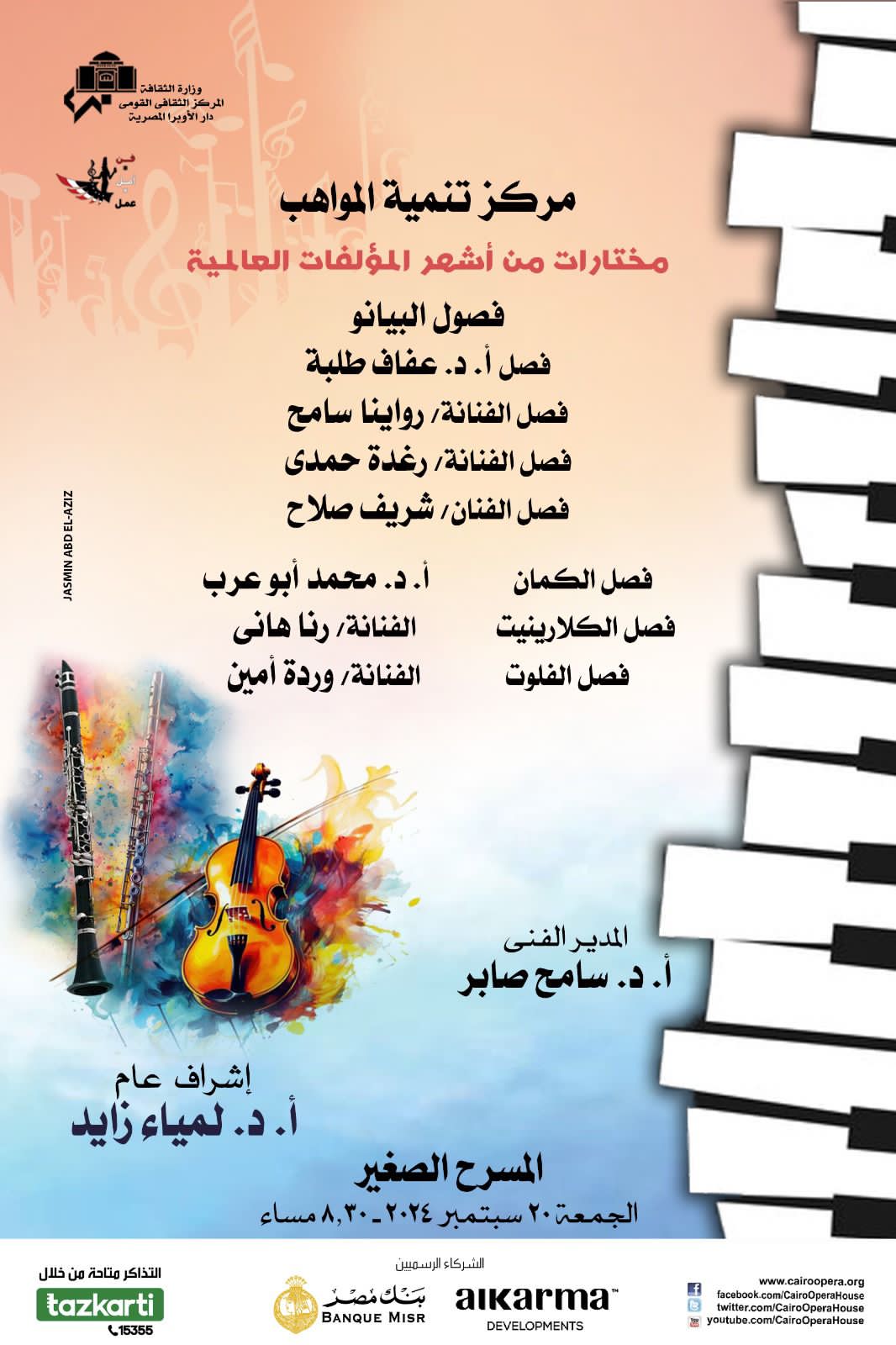 فى إطار اهتمام الثقافة المصرية بدعم المواهب وتشجيعها تقدم دار الأوبرا برئاسة الدكتورة لمياء زايد حفلا لطلاب ٧ فصول بمركز تنمية المواهب للعزف على ألآت ( البيانو-الكمان-الكلارينيت-الفلوت) تحت إشراف المدير الفنى الدكتور سامح صابر وذلك في الثامنة والنصف مساء الجمعة ٢٠ سبتمبر علي المسرح الصغير .